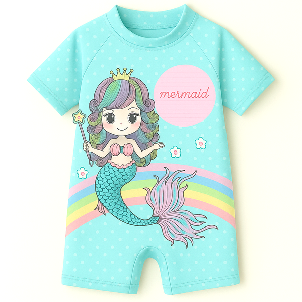 • Make a splash with this adorable Bubble Berry swimming costume for girls! The charming design features a delightful mermaid motif set against a beautiful aqua backdrop, complete with a magical rainbow and whimsical details that little ones will love. Crafted from a premium blend of 88% polyester and 12% spandex, this swimwear offers excellent stretch and comfort for active water play. The short-sleeved design provides extra coverage whilst the one-piece style ensures hassle-free wear. Perfect for swimming lessons, beach outings, or pool parties, this swimming costume combines practicality with enchanting style. The soft, quick-drying fabric maintains its shape and colour, making it ideal for regular use. Available in aqua with adorable mermaid graphics, this swimwear will make every water adventure more magical. The comfortable fit and durable construction ensure your little swimmer can focus on having fun in the water. Please refer to the size chart to ensure the perfect fit for your little mermaid.