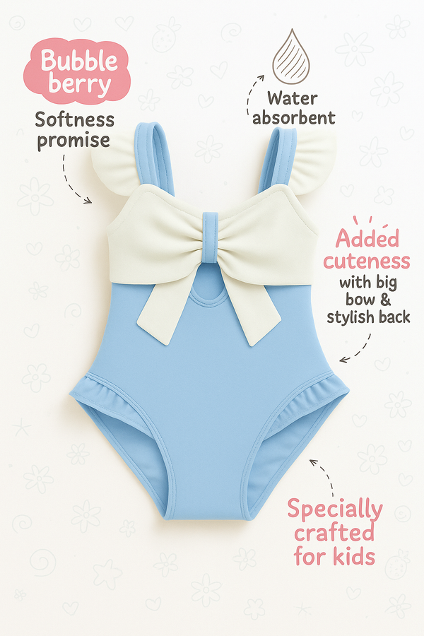 • This charming Bubble Berry swimsuit combines style and comfort for a delightful beach or pool day. The swimwear features an adorable light blue and white colour scheme with elegant ruffle trim details that add a playful touch. The design includes a lovely bow accent and ruffled edges that create a sweet, feminine look. Made with stretchy, comfortable fabric, this swimming costume allows for easy movement during water activities. The sleeveless design with ruffle-trimmed straps provides a secure fit while maintaining a fashionable appearance. Perfect for swimming lessons, beach outings, or poolside fun, this swimsuit offers both functionality and style. The contrast white bow detail on the light blue base adds a distinctive charm to this swimming attire. The swimsuit's contemporary design makes it a versatile choice for various water-based activities. Available in different sizes, please refer to the size chart for the perfect fit.