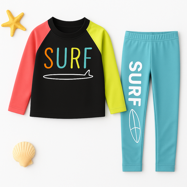 • Make a splash with this stylish and protective rash guard swimsuit designed for active girls. The colour-block design features a navy body with vibrant neon sleeves and 'SURF' typography, paired with coordinating light blue bottoms. Crafted from a premium blend of 88% Polyester and 12% Spandex, this swimwear offers excellent stretch and recovery while maintaining its shape. The full-sleeve design provides enhanced sun protection during water activities. Perfect for swimming, surfing, or beach play, this swimsuit combines fashion with functionality. The moisture-wicking fabric ensures quick drying and lasting comfort. The athletic fit allows unrestricted movement while swimming or playing at the beach. Available in multiple sizes, this swimwear set is ideal for regular swimming sessions or beach holidays. Hand wash recommended to maintain the vibrant colours and fabric quality. Note: Please refer to the size chart for the perfect fit.
